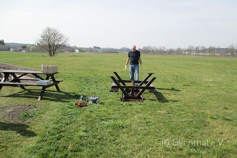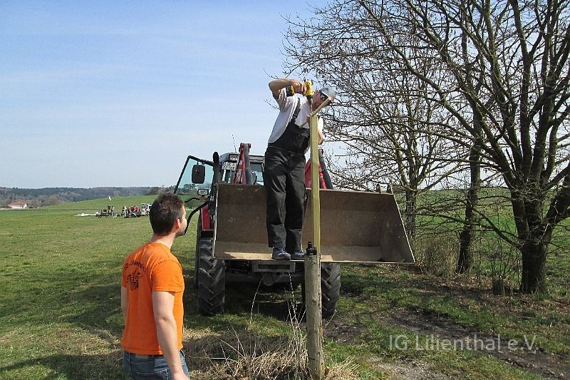 Hier wird gerade einer der Pfähle für die Warnschilder vorbereitet, mit denen Spaziergänger auf den Flugbetrieb hingewiesen werden sollen - mit tatkräftiger Unterstützung durch den Nachwuchs.