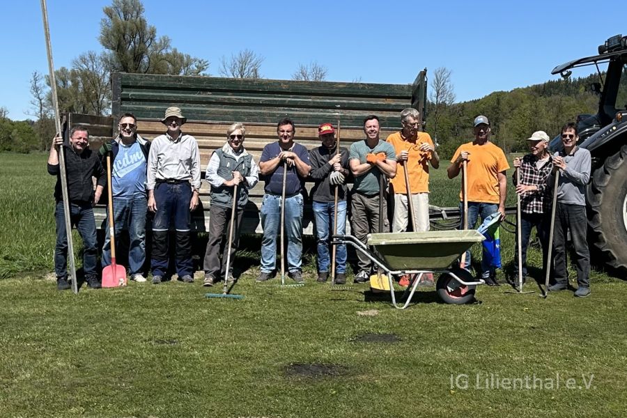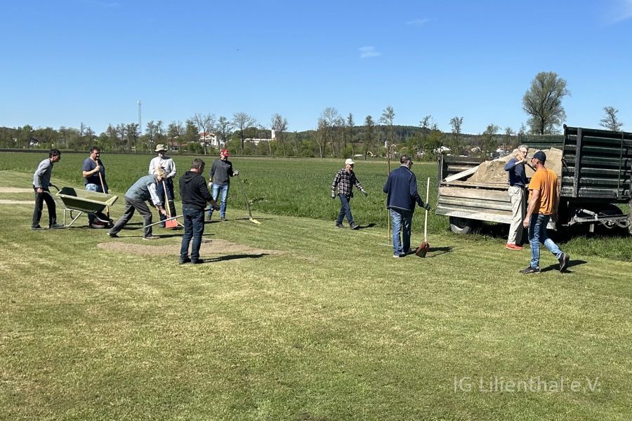 Begonnen wurde mit dem Arbeitstag und hier insbesondere mit dem Beseitigen der vielen Wühlmauslöcher und der durch die vergangene Trockenheit verursachten Unebenheiten. Dieses Jahr waren es besonders viele und daher 2 Kubikmeter Erde erforderlich, um alles aufzufüllen. Wegen der vielen Helfer war alles am Vormittag getan.