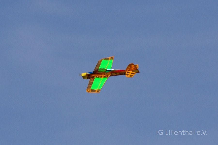 Zunächst zum Motorkunstflug. Bei idealem Wetter (fast kein Wind ) und vor vielen Zuschauern zeigten 6 Teilnehmer ihre Fertigkeiten beim Kunstflug. Aus einer Liste von 10 Figuren (Looping, langsame Rolle, Immelmann, waagerechte Acht, auf- und absteigendes S, Humpy Bump, Schräger Humpty Bump, Abstieg mit halber Rolle, halbe kubanische Acht mit halber Rolle) konnten 5 ausgewählt werden, die dann in 2 Durchgängen geflogen wurden.Jede der 5 Figuren und zusätzlich Start und Landung wurden jeweils mit maximal 10 Punkten bewertet und dann mit dem sog. K-Faktor multipliziert., der je nach Schwierigkeit der gewählten Figur zwischen 6 und 14 variiert. (Start und Landung haben beispielsweise einen K-faktor von 6, der Looping eine Faktor 10 und die halbe kubanische Acht einen von 14).