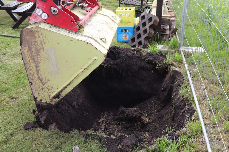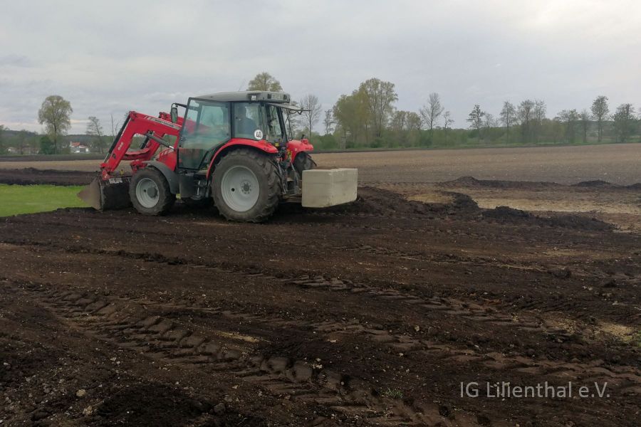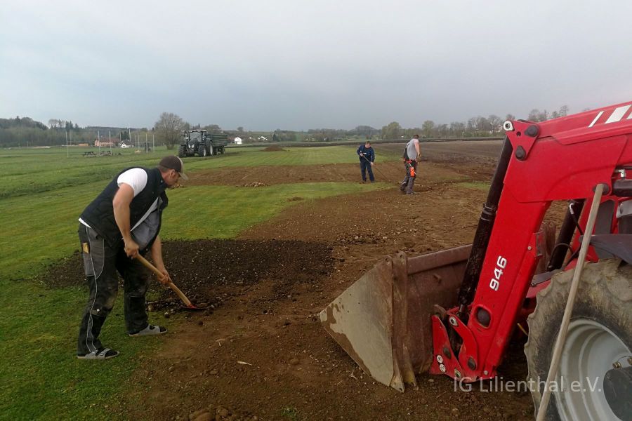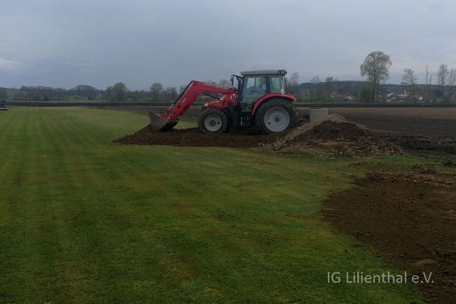 Hintergrund war die zusätzliche Pacht von 1000 m2 nördlich der Piste als weiterer Sicherheitsbereich. Da dieser Teil des Feldes an das Niveau unseres Platzes angeglichen und dabei Erdreich abgetragen werden musste, war es naheliegend damit und mit weiteren Ladungen Sand gleich auch die Piste weiter einzuebnen.