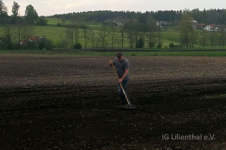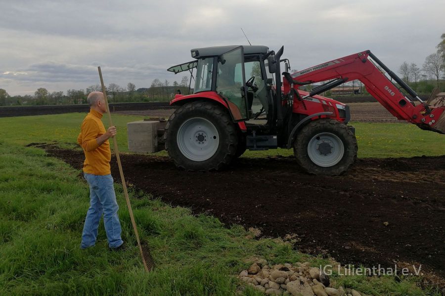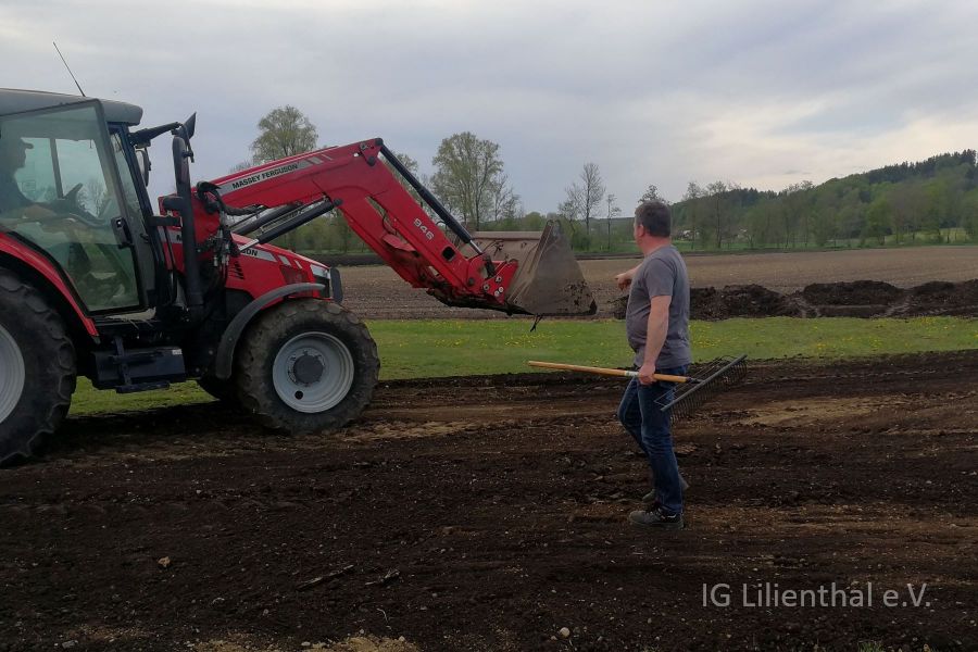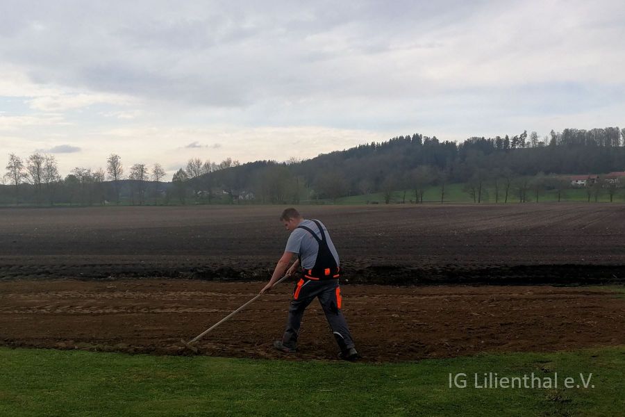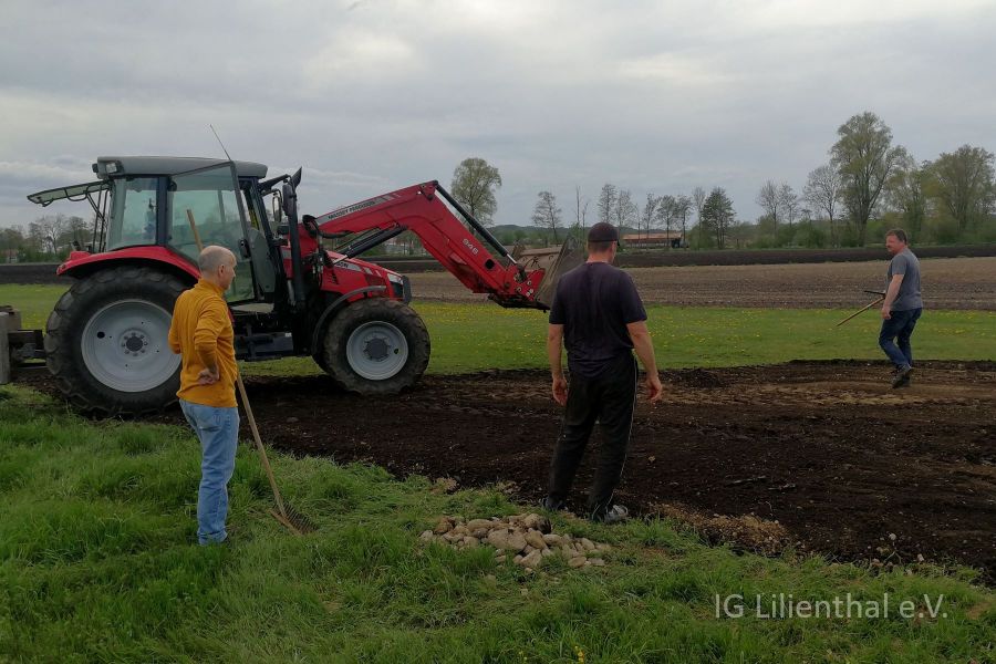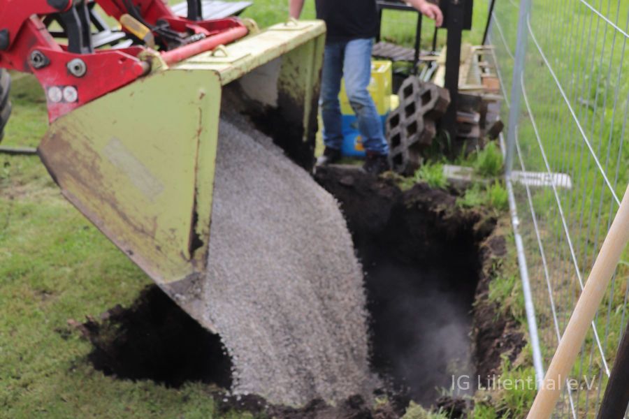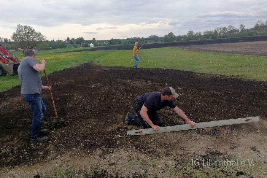 Am 10. Mai wurde dann von Wolfgang, Oliver und den beiden Roberts Gras gesät und die Deckschicht aufgetragen. Dazu und zum ersten der beiden Arbeitstage auch ein paar Bilder