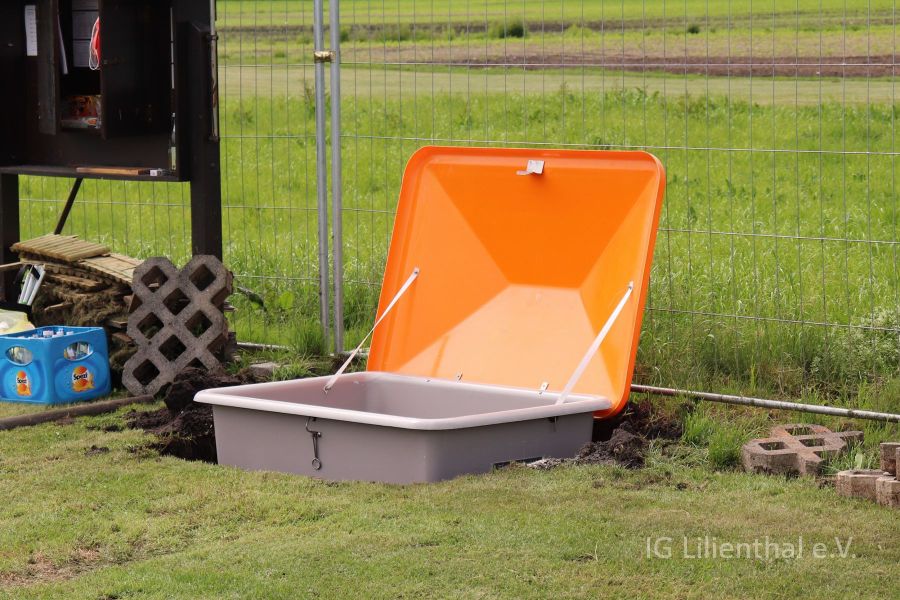 Daher wurde die Beschaffung einer neuen Kiste beschlossen und am 8. Juni war es dann soweit: die neue Kiste wurde im Boden versenkt. Dazu die folgenden Bilder.