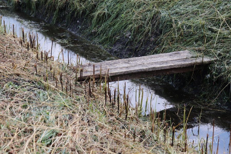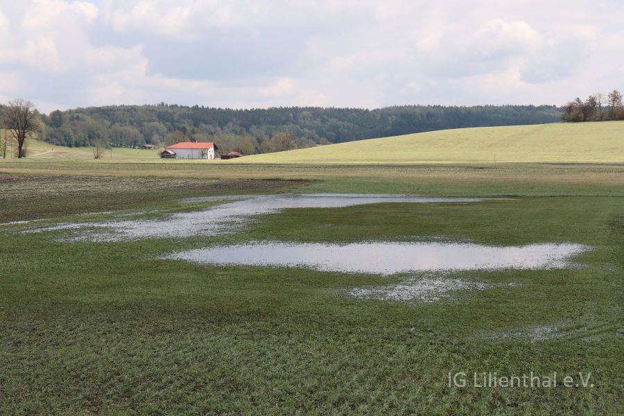 Und wieder steht unser Flugplatz in Teilen unter Wasser. Wie das Bild zeigt, ist der Frequenzkasten nur barfuss (erfahrungsgemäß nicht empfehlenswert: kann zu Ausschlag an Füßen und Beinen führen) oder in Gummistiefeln zu erreichen. Und unsere sog. Getränkekiste ist noch ein weiteres Stück aus dem Boden aufgestiegen und steht jetzt etwas schief da. Auch auf der rechten Seite steht die Piste unter Wasser. Wasserflug erfordert allerdings Flieger mit relativ kurzem Startweg, da beide Wasserflächen für lange und flache Starts nicht ausreichend groß sind.