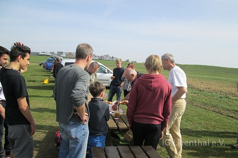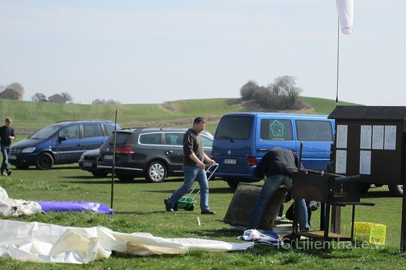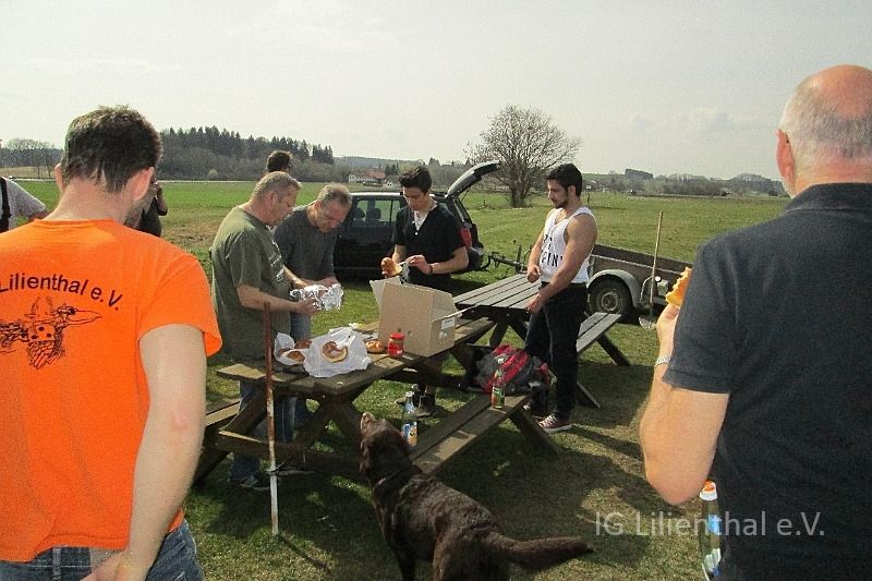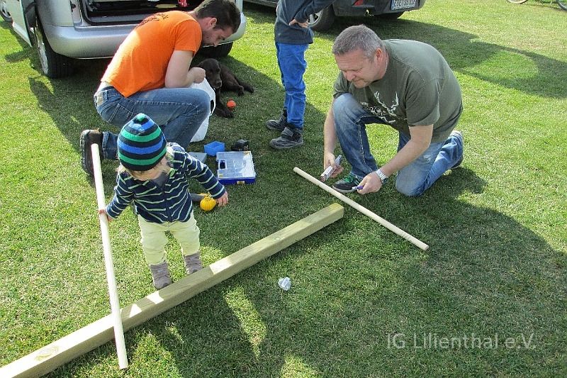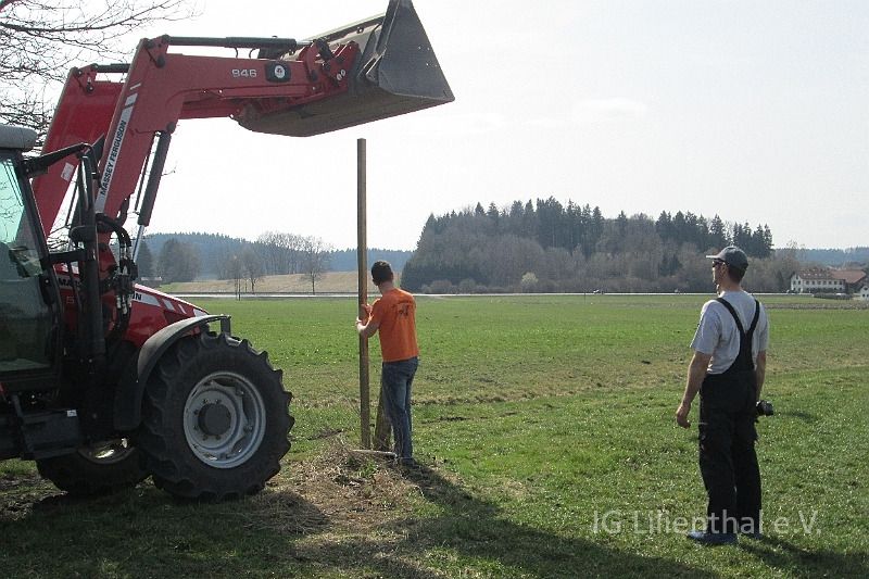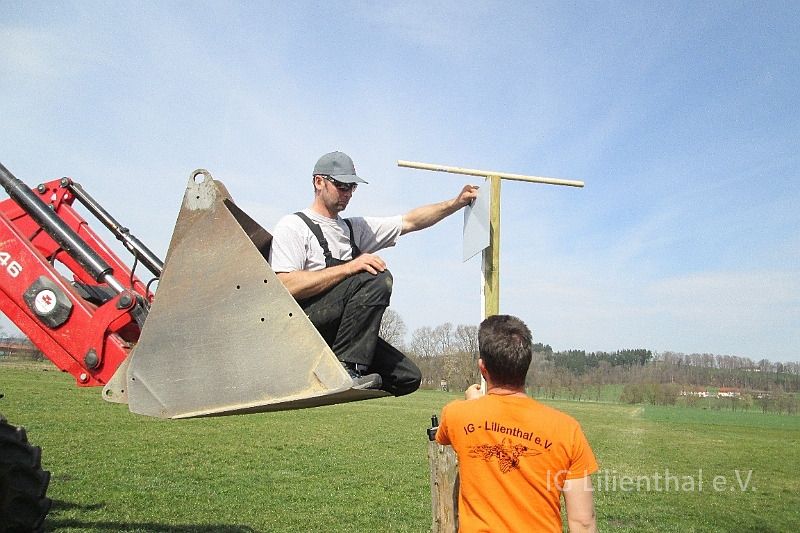 Hier wird gerade einer der Pfähle für die Warnschilder vorbereitet, mit denen Spaziergänger auf den Flugbetrieb hingewiesen werden sollen - mit tatkräftiger Unterstützung durch den Nachwuchs.