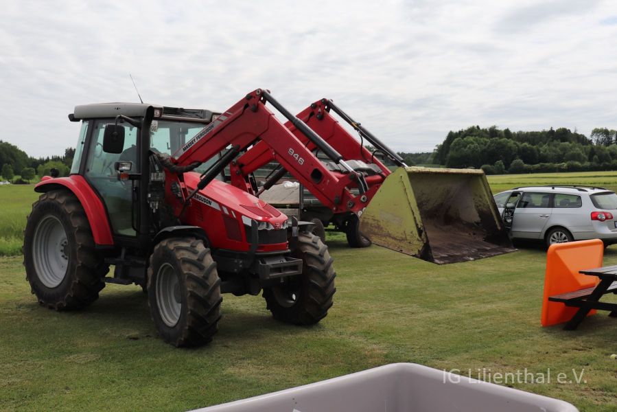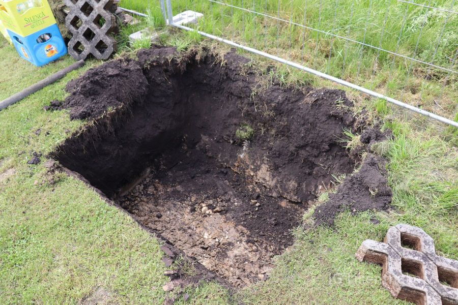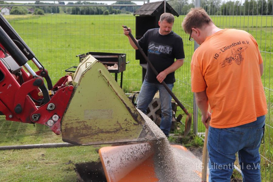 Nötig war ferner etwas schwereres Gerät zum Erweitern der Bodenvertiefung und Schüttgut (auf dem Hänger im Hintergrund). Traktor und Hänger kamen - wie so oft - von Robert.