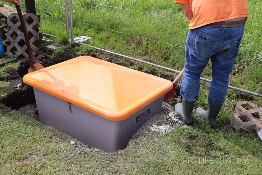 Endlich wurde eine neue und größere Kiste beschafft und in der Erde versenkt.