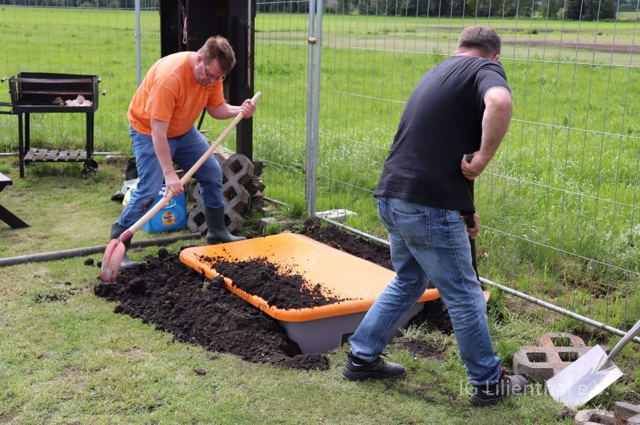 Mit einer passenden Schaufel und dem notwendigen Geschick konnte das vorhandene Erdloch schnell erweitert werden. Schließlich war die neue Kiste nicht nur neu sondern auch größer.