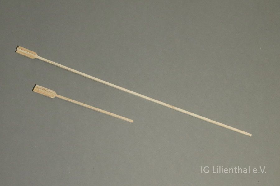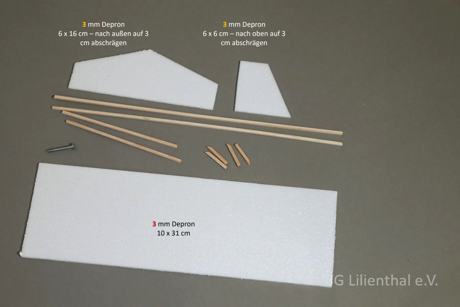- Balsastäbe 3 x 3 mm in den Längen 31, 13 und 3 cm. Die kurzen Stäbe sind an einem Ende abgeschrägt