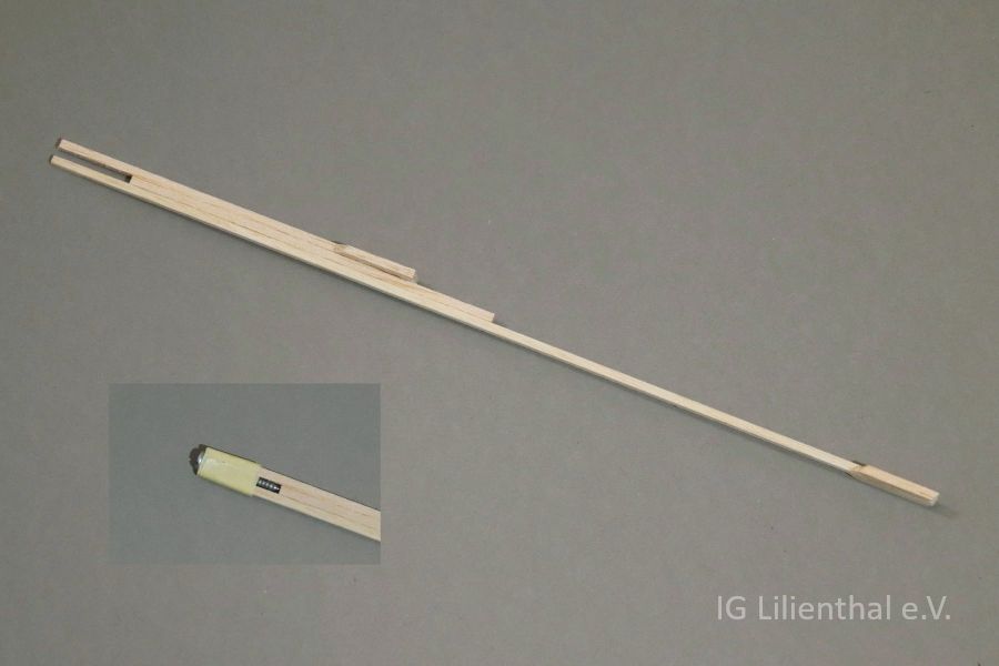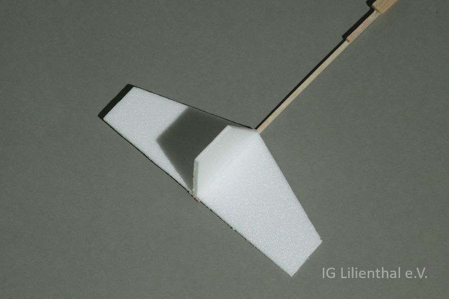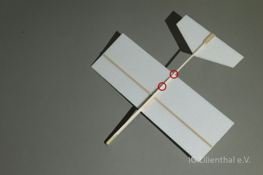 . . . den zweiten langen Stab genau gegenüber der Kerbung auf den Flügel aufkleben.