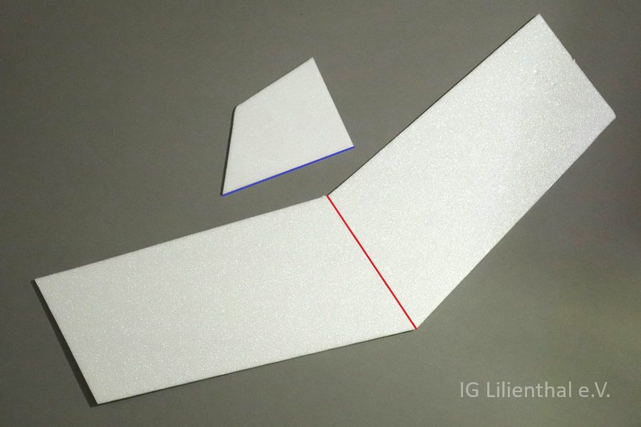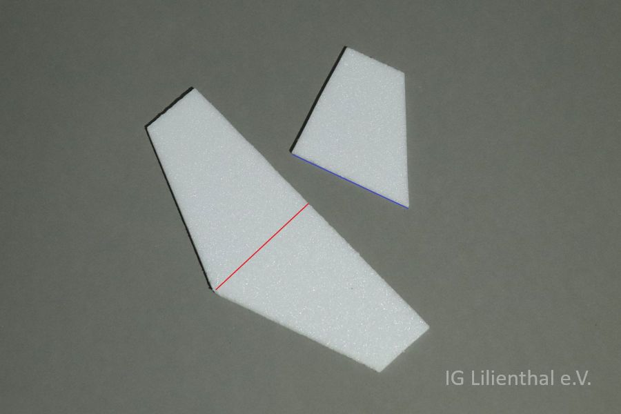 Nach dem Ausschneiden von Flügel und Seitenruder zunächst auf die Unterkante des Seitenruders (blaue Linie) dünn den Kleber auftragen und das Seitenruder entlang der roten Line auf den Flügel setzen und sofort wieder entfernen.