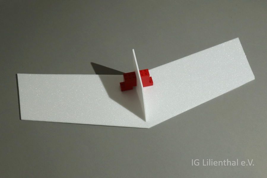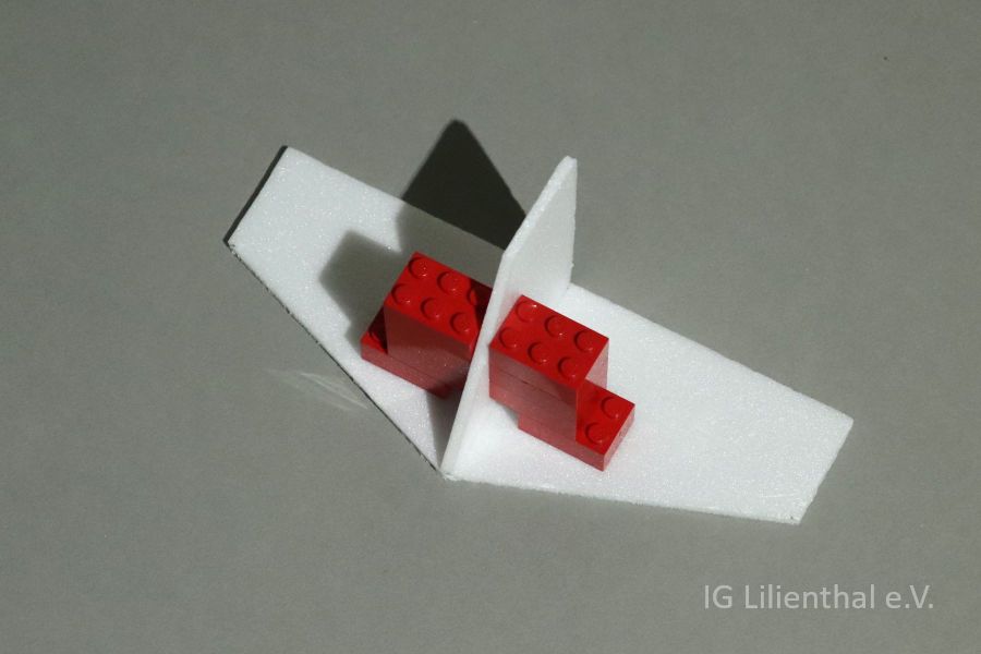 Nach 10 bis 20 Sekunden (der Kleber ist dann auf beiden Teilen angetrocknet) das Seitenruder wieder auf den Flügel setzen, andrücken und mit den Legosteinen die senkrechte Position fixieren.