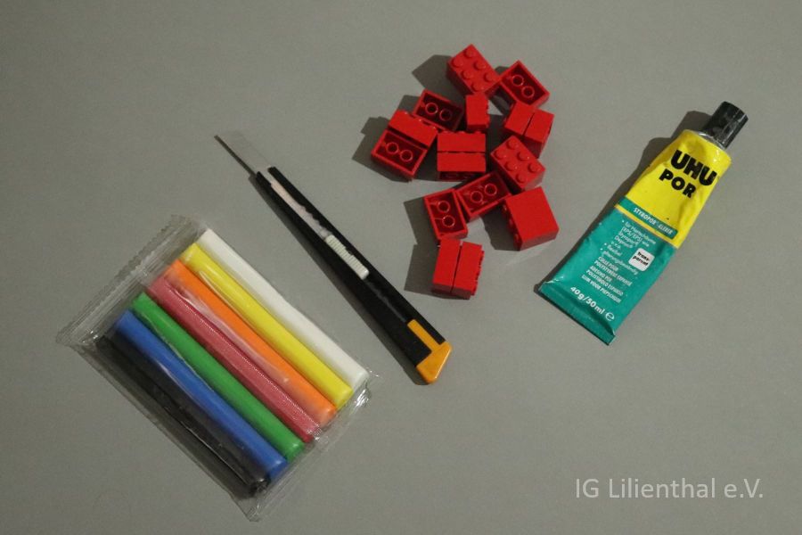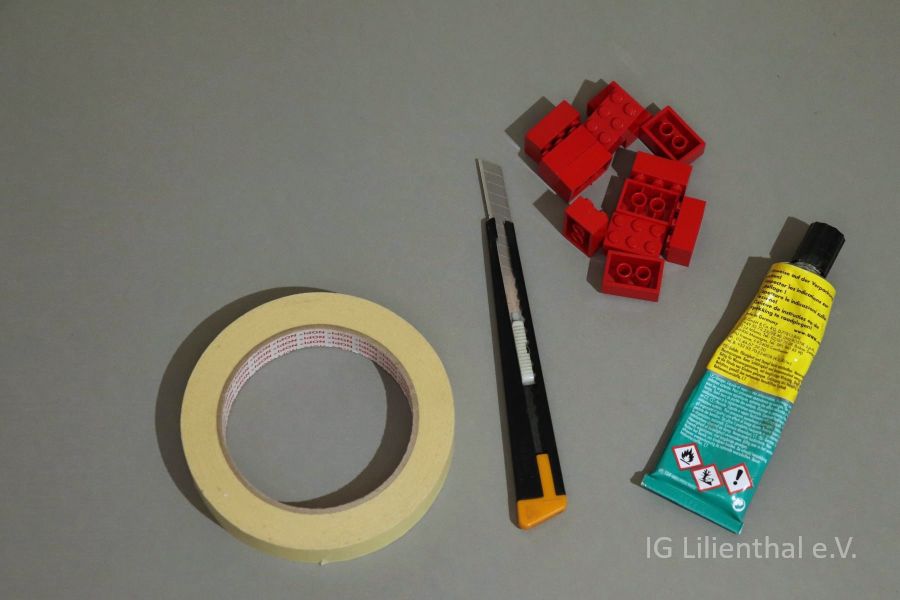 Der unterste Legostein ist versetzt, damit er nicht mit eventuell austretendem Kleber in Berührung kommt.