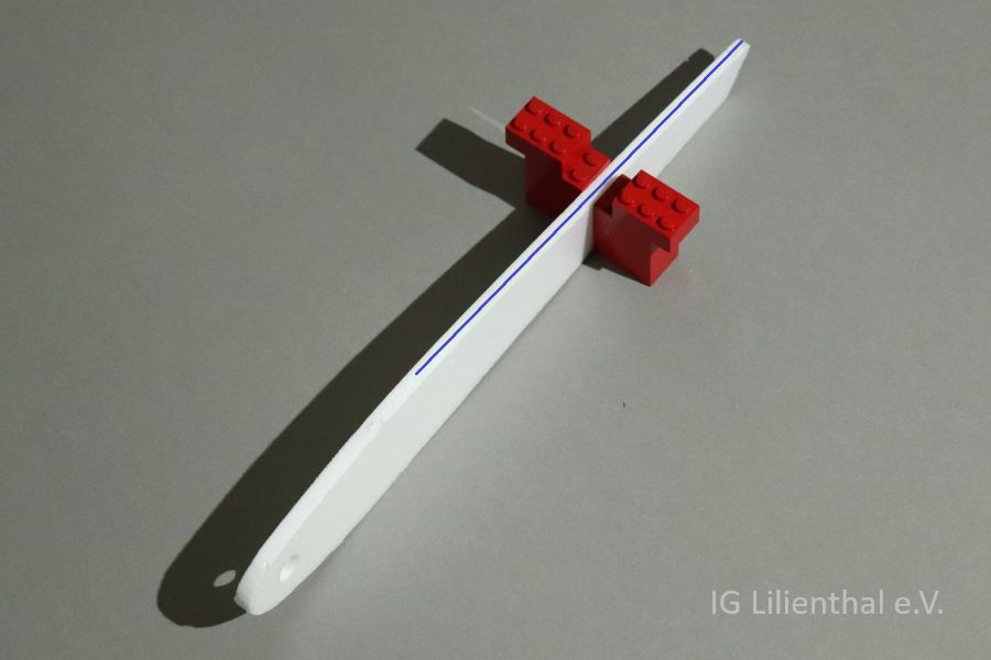 Ferner den Flieger an den Enden der Flügelleiste auf zwei Fingerspitzen setzen und vorne zusätzlich Klebeband wickeln bis der Flieger waagerecht bzw. ganz leicht nach vorne geneigt auf den Fingerspitzen aufliegt.