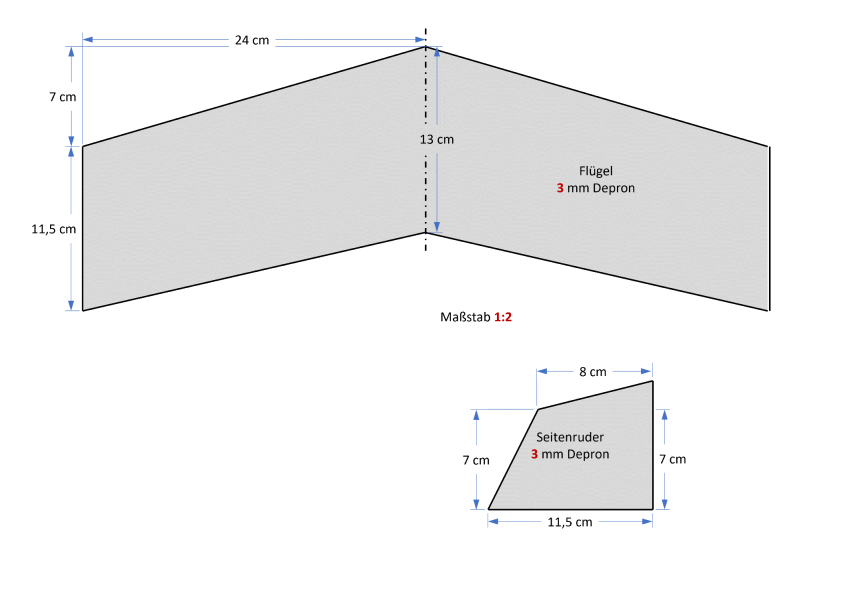 Die Zeichnung ausdrucken (siehe PDF-Datei), auf die Depron-Platte heften und mit dem Cutter ausschneiden.